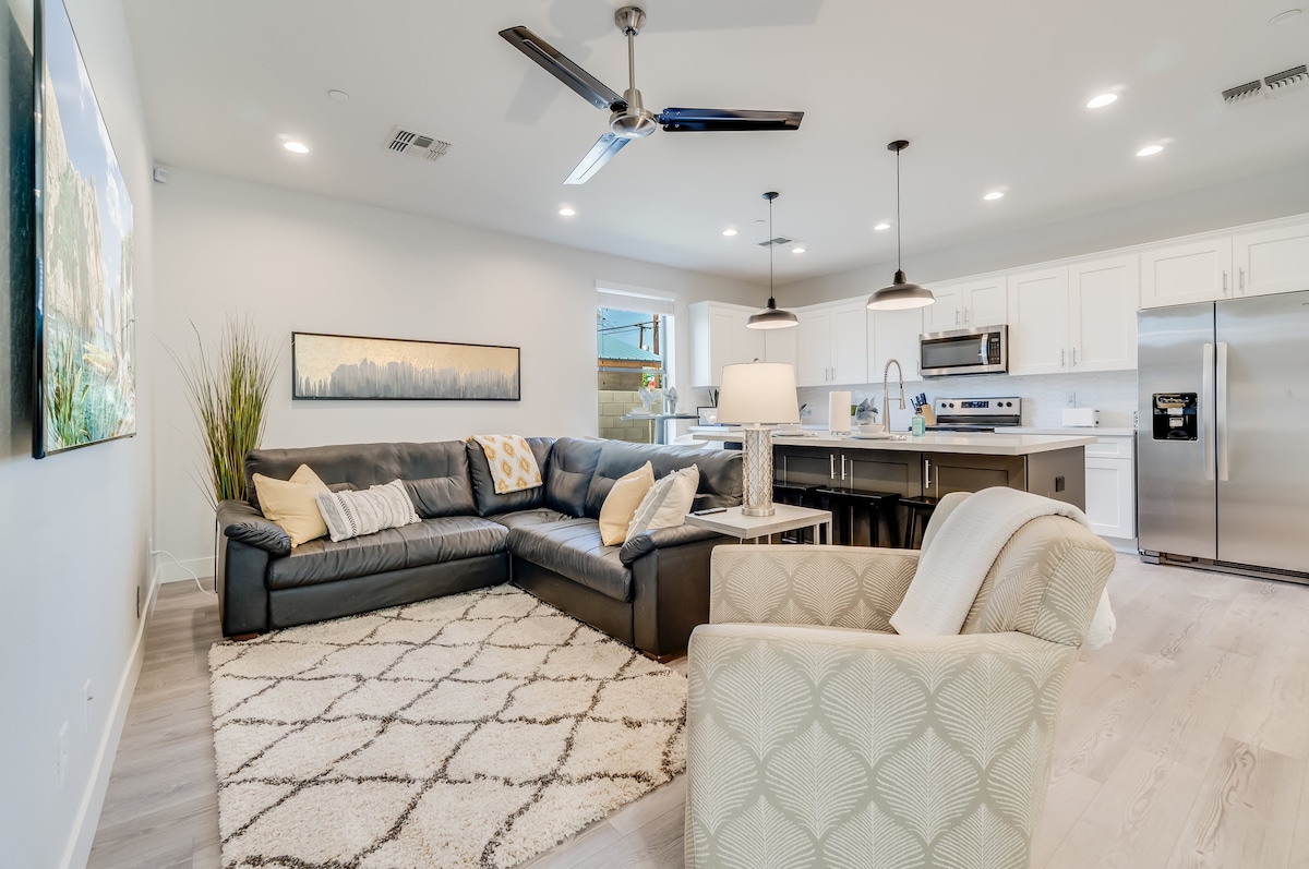Árasán 1 Seomra Leapa 1,200 Troigh Cearnacha, lán-troscánaithe go galánta Árasán ar bhunurlár atá suite i gCroílár Tempe/ASU agus cúpla nóiméad ó Tempe Town Lake, Gammage, Old Town Scottsdale, Papago Park agus ospidéal St. Luke's. Leaba Mhéid an Rí. Teilifíseáin Roku 55" don seomra suí agus don phríomhsheomra leapa. Wi - Fi ardluais. Le Féinseiceáil Isteach, bíonn rochtain éasca ann trí chód uathúil 4 dhigit a sheoltar ar an lá a thagann tú. 2 Spás Páirceála Saor in Aisce ar an gcabhsa. 8 gcéim ón gcarr go dtí an doras tosaigh. Bealach isteach dea-shoilsithe.