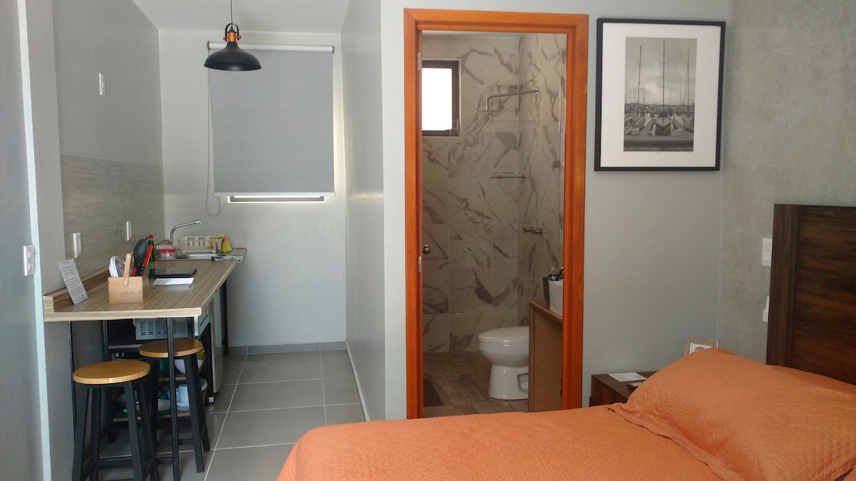 Amplio loft con cocina, baño privado, smart t.v, televisión por cable, aire acondicionado, closet y entrada independiente por vestíbulo, hermoso patio compartido.