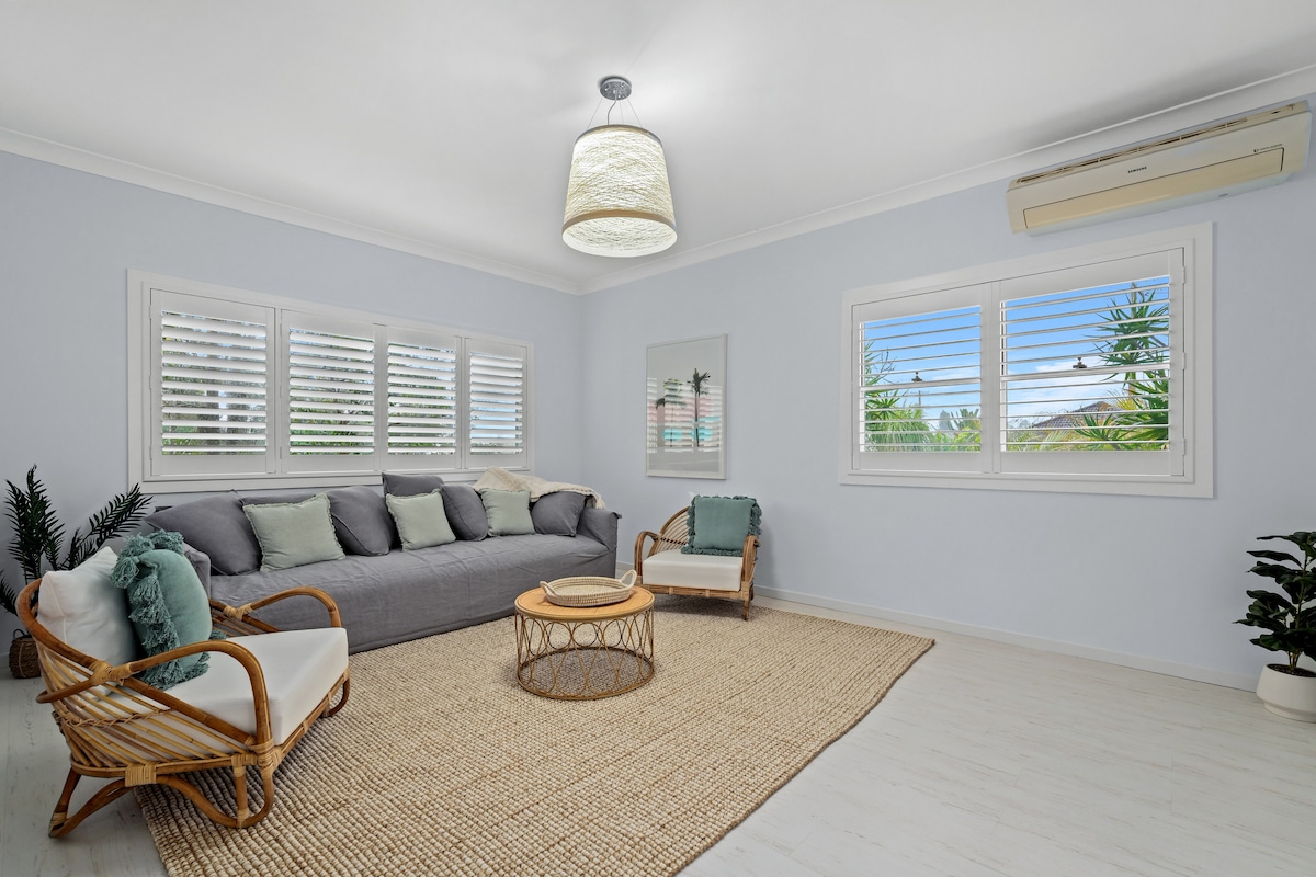 Lig do scíth, díphlugáil agus lig do scíth don deireadh seachtaine ag an tearmann tuaithe seo cois trá. Teach iontach 2 sheomra leapa ina bhfuil na háiseanna nua - aimseartha go léir, suite ar leath acraí díreach nóiméad go Bá Bateau, Forresters agus tránna Wamberal. Áit shiamsaíochta alfresco agus clós mór do na páistí/do chairde clúmhacha. Tabhair cuairt ar ár ngabhair, ár gcupáin agus ár mbuíonán agus beathaigh iad. Is é Lucy (Boxador Retriever) ár n - óstach leis an gceann is mó agus cuirfidh sé fáilte romhat nuair a thiocfaidh tú.