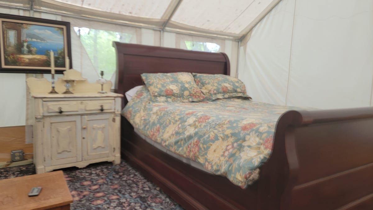 Éalaigh go dtí ár n - ósais atá lán den dúlra ar 25 acra de thalamh feirme príobháideach! Tum thú féin sa dúlra gan compord a íobairt. Tá leaba rí theolaí, seomra folctha lasmuigh, beárbaiciú, & poll dóiteáin inár bpuball. Timpeallaithe ag radhairc iontacha ar an dúlra agus ar thalamh feirme. Déan iniúchadh ar chosáin fánaíochta & fíonlanna in aice láimhe, bain sult as stánadh cois tine, nó lig do scíth agus déan athcheangal leis an dúlra. Má tá tú ag lorg saoire ghearr rómánsúil, tá ár n - eispéireas glampála saincheaptha chun d'ionchais a shárú.