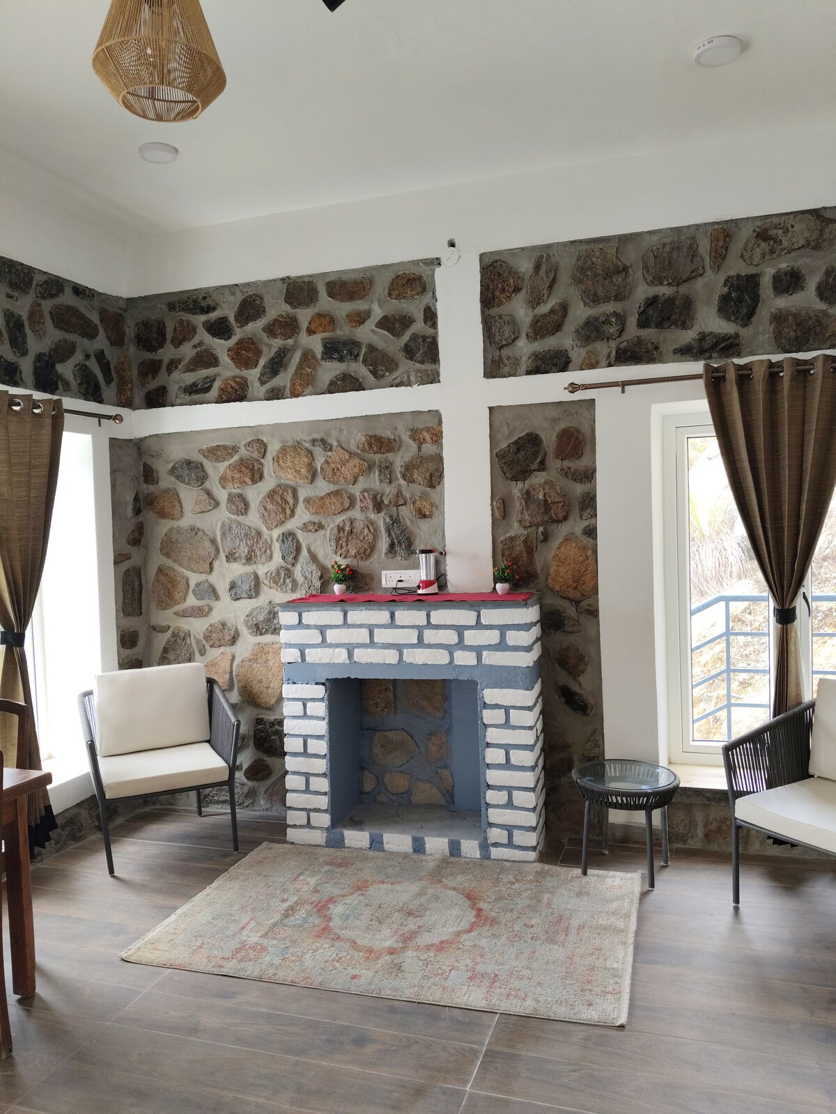 Teachín cloiche athchóirithe ag 3,300 troigh in Vagamon, Kerala. Tearmann éiceolaíoch neamhcheangailte leis an eangach ar chúig acra d'fhoraois — cumhacht na gréine agus na gaoithe, béilí ón bhfeirm go dtí an bord ón gCócaire Anoop, gan teilifís, agus fíorshuaimhneas. Bhí an teachín ina sheid saothair ar eastát oibre tráth. Ballaí cloiche bunaidh, taobh istigh compordach, veirinn ag breathnú amach ar an ngleann. Ní ionad saoire é. Níl aon linn snámha ann, ná spá. Cad atá ann: amhrán an choirneoga ag breacadh an lae, tinte cnámh faoi Réaltbhrach na mBó Finne, agus an mothú go bhfuil tú i bhfad ar shiúl ón saol.