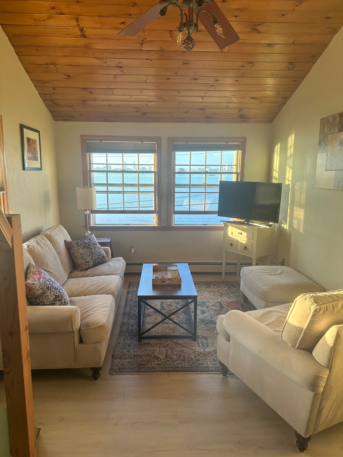 Tóg go bog é ag an áit uathúil seo a ndearnadh athchóiriú uirthi le déanaí ina bhfuil 2 sheomra leapa agus radhairc iontacha ar Bhostún. Tá an t-aonad seo suite ar an dara hurlár agus ar an 3ú hurlár de theach ina bhfuil 2 aonad. Seomra leapa príomhbhanríona agus ar an dara hurlár 2ú seomra leapa ina bhfuil leabaí singil suite ar an 3ú hurlár ón lochta le staighre níos géire féach pictiúir. Luí gréine iontacha agus radhairc oíche ar spéirlíne Bhostúin gar do Bhá Marina ina bhfuil go leor beár agus bialanna suite ar fad ar leithinis ghalánta Squantum