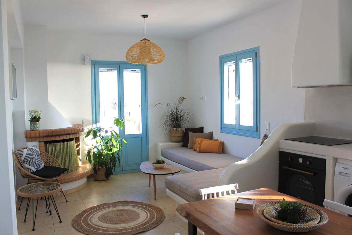 Teachín nua - chóirithe, atá suite i gceantar Agios Dimitrios ar an taobh thoir theas d'oileán Tinos. Iomlán atá neamhdhíobhálach don chomhshaol agus uathrialach agus an chumhacht leictreachais ag teacht ó ghrianphainéil. 1 phríomhsheomra leapa le leaba dhúbailte, seomra suí ina bhfuil dhá thoilg is féidir a úsáid chun duine fásta amháin agus leanbh a shásamh. Maisiú íosta agus scíth a ligean le hailtireacht thraidisiúnta. Tá an gairdín lán de chrainn shéasúracha agus glasraí bith - spreagtha. Bain sult as do bheárbaiciú príobháideach leis an radharc iontach.