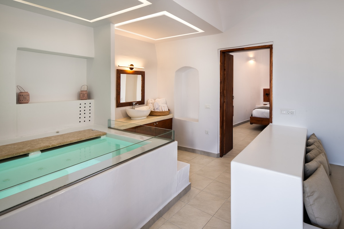 Tá svuít ina bhfuil linn snámha téite ar an díon agus tobán te faoi dhíon 1.5 km ó Caldera, ag meascadh só le mionsonraí mionsonraithe, ag cur fáilte romhat! Is é an díon an áit is fearr leat chun taitneamh a bhaint as an deoch is fearr leat, in aice leis an tobán te, ag féachaint ar luí gréine iontach an Aeigéach. Tum thú féin in atmaisféar draíochtúil rómánsúil na dtránna órga agus na spéartha glana gorma. In aice láimhe, aimsigh raidhse bialann, tithe tábhairne traidisiúnta agus beár. Wi - Fi & páirceáil saor in aisce