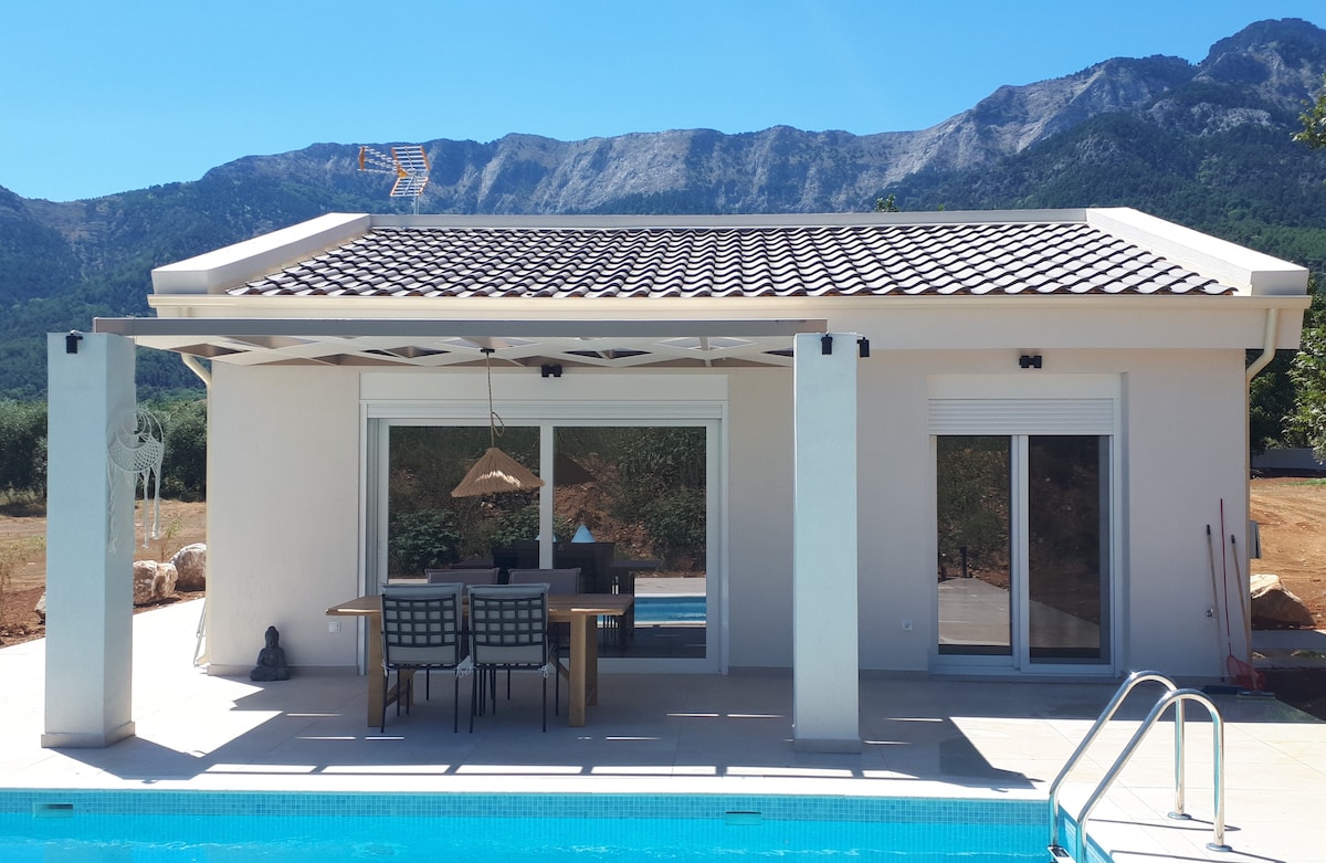 Tógadh é le déanaí in 2021, tá an teach teolaí suite i lár garrán iontach olóige. Suíomh lárnach agus fós oiriúnach do lucht iarrtha síochána agus do dhaoine a bhfuil dúil acu sa dúlra. Ardán mór le linn snámha phríobháideach agus radharc iontach ar na sléibhte. Wi - Fi, teilifís scáileáin chomhréidh agus aerchóiriú. Tá an ciliméadar ar fhad, trá ghainmheach bhreá (Trá Órga) faoi fhad siúil. Tavernas ináitrithe, bácús agus ollmhargadh sa gharchomharsanacht. Táimid sásta leideanna ón taobh istigh a thabhairt maidir le turais, bialanna, srl.