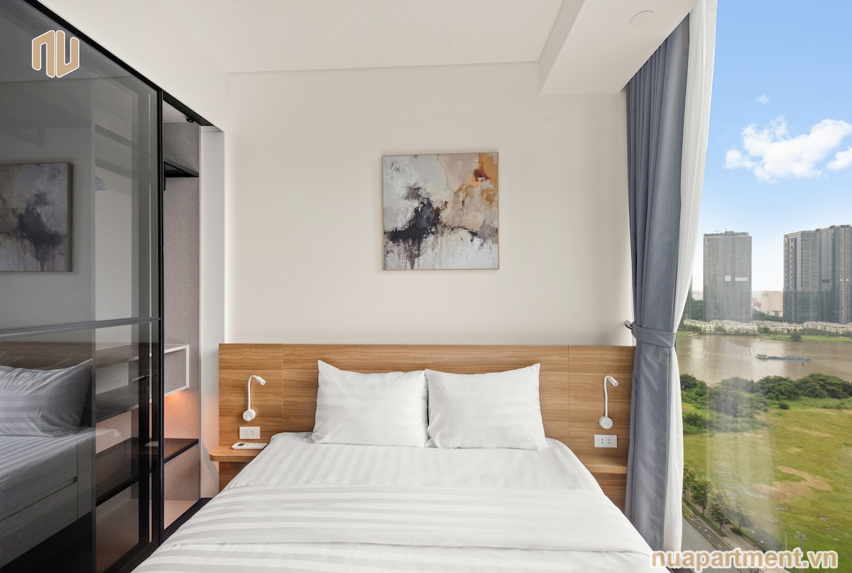 Tá an áit uathúil seo deartha le haghaidh eispéireas sómasach i stíl. Le doras sleamhnáin cliste, tá do sheomra suí agus do sheomra leapa ceangailte go héasca chun teach fairsing 50m2 a uasmhéadú. Ag siúl ar dhroichead BaSon idir an condo agus D1, is féidir leat boladh abhainn Saigon agus radharc iontach ar an gcathair a mhothú. Faoi 5 go 10 nóiméad ar chábán, is féidir leat dul go lár na cathrach.