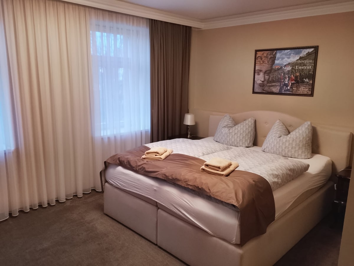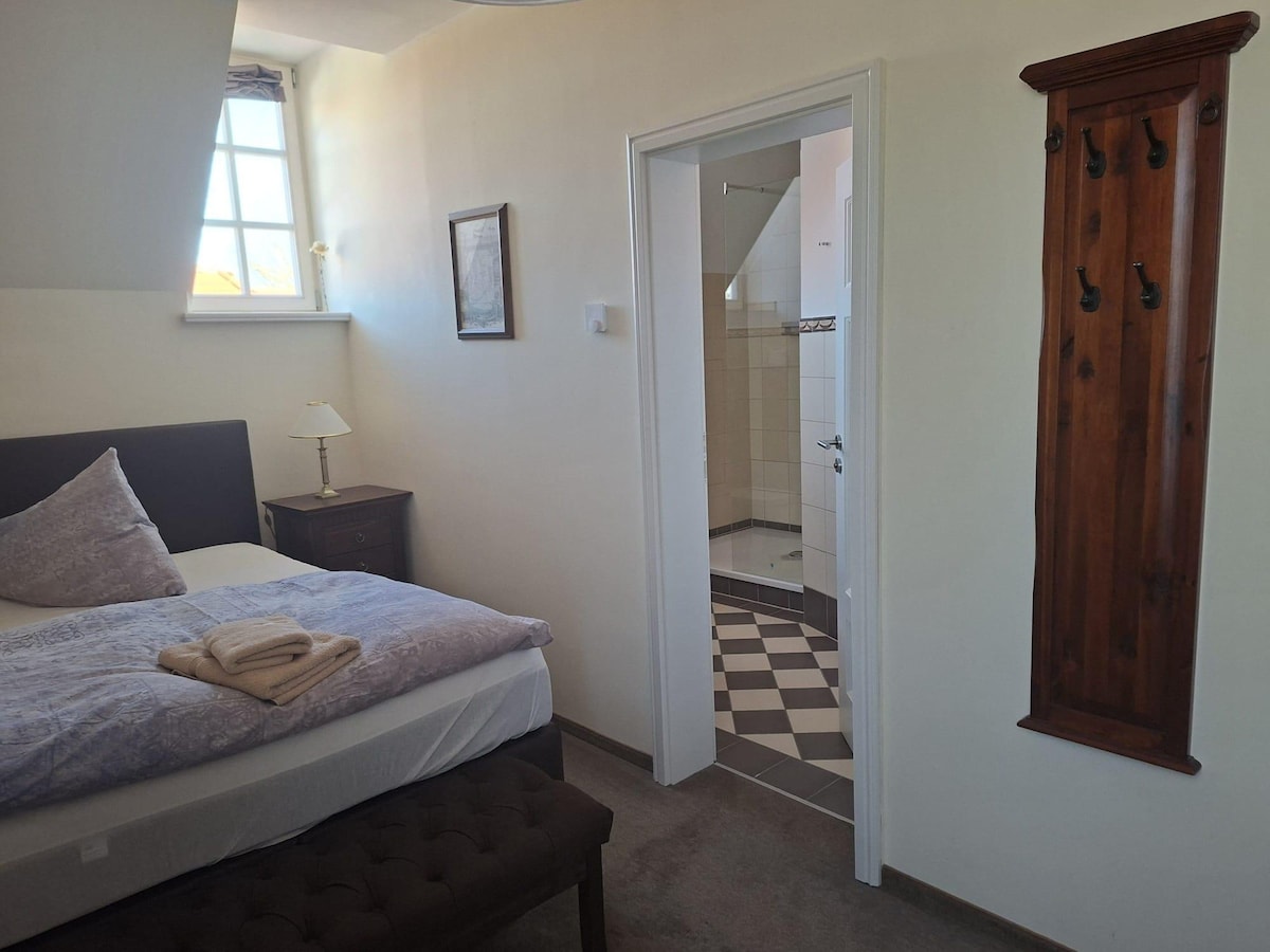 The family room offers space for up to four people and a cot across approximately 30 m². It consists of two adjoining rooms with an en-suite bathroom and is ideal for families. Facilities include two double beds (180 cm each), a TV, free Wi-Fi and a seating area. A highlight is the view of Droyßig Castle. A miniature railway is currently being built in the garden. The proximity to the moat with the Droyßig bears makes the room particularly family-friendly.