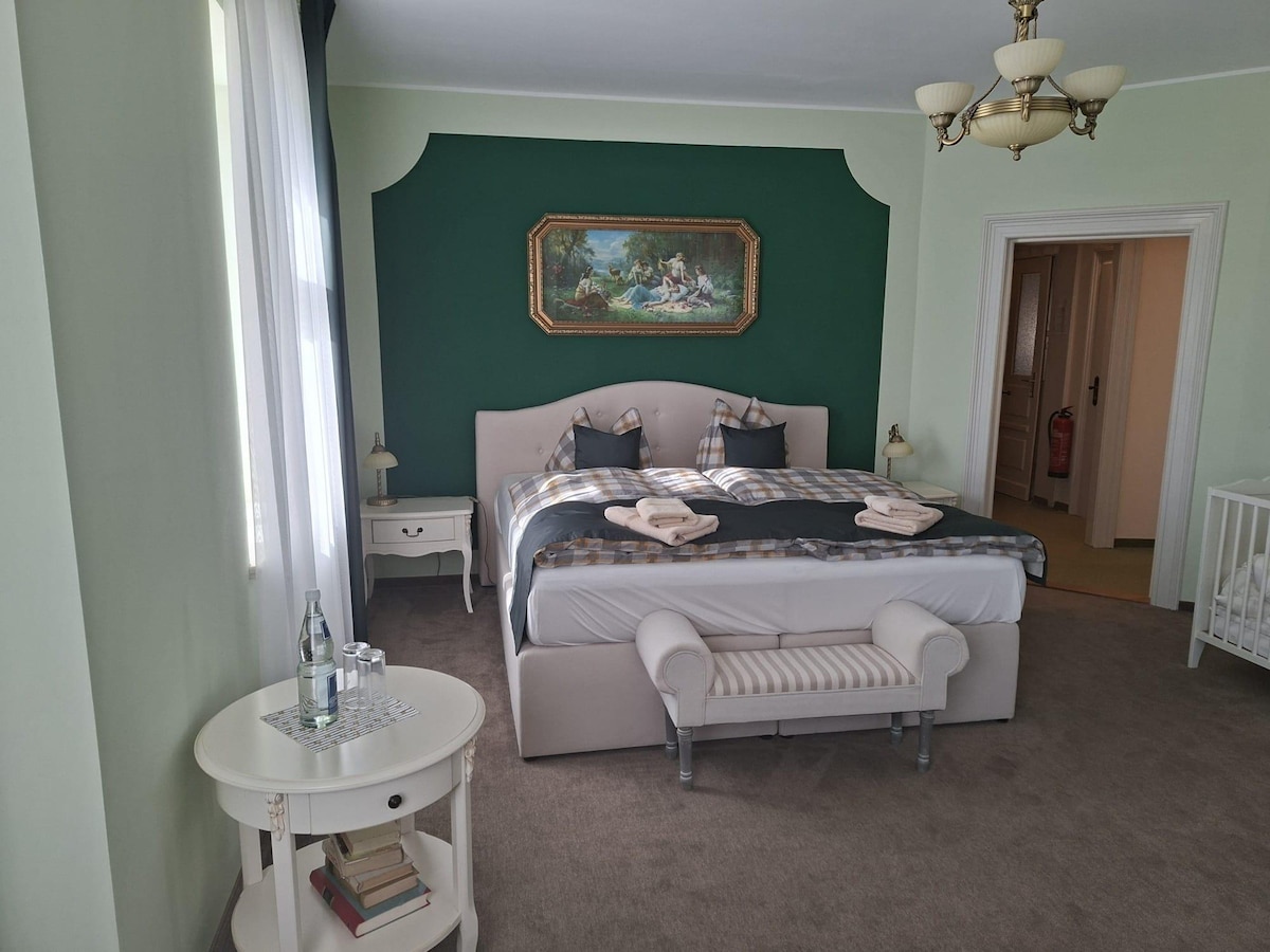 The double rooms combine modern amenities with the historic charm of the villa. Measuring approximately 10 m², they can accommodate two people and feature a comfortable box-spring bed (180 cm), an en-suite bathroom, a TV and free Wi-Fi. The lounges and garden are available to all guests, and the home cinema can be used on request. The peaceful location right next to the woods makes the rooms ideal for guests seeking relaxation and the great outdoors.