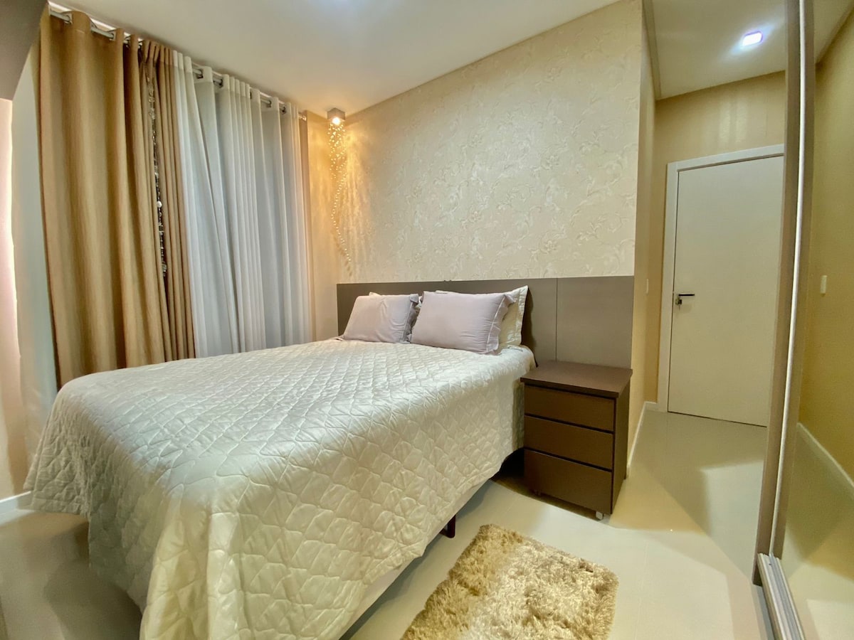 2 suítes com lavabo bem espaçosa com 80 m2. Perto de tudo(supermercado, cafeteria e etc) se quiser, nem precisa usar carro. Privacidade total(1 AP por andar c/ elevador). No imóvel têm 2 camas de casal, uma mesa de refeições, 1 colchão e 1 sofá-cama. Talheres, panelas, copos, chaleira, 1 geladeira, máquina de lavar, micro-ondas, forno elétrico e 1 filtro de água. Gás encanado, Internet 500 mb, 2 tvs. Chuveiro aquecido a gás e 1 vaga estac. Comporta até 6 pessoas.
