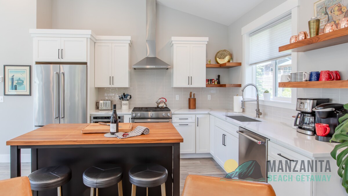 Níl ár saoire ghearr shuaimhneach aigéin díreach troigh ó cheann de na tránna is áille ar an gcósta thiar. Cuirfidh floorplan oscailte, cistin mhór, seomra suí, ballaí adhmaid cedar saincheaptha agus go leor leapacha compordacha ar do shuaimhneas mar a bheifeá sa bhaile!