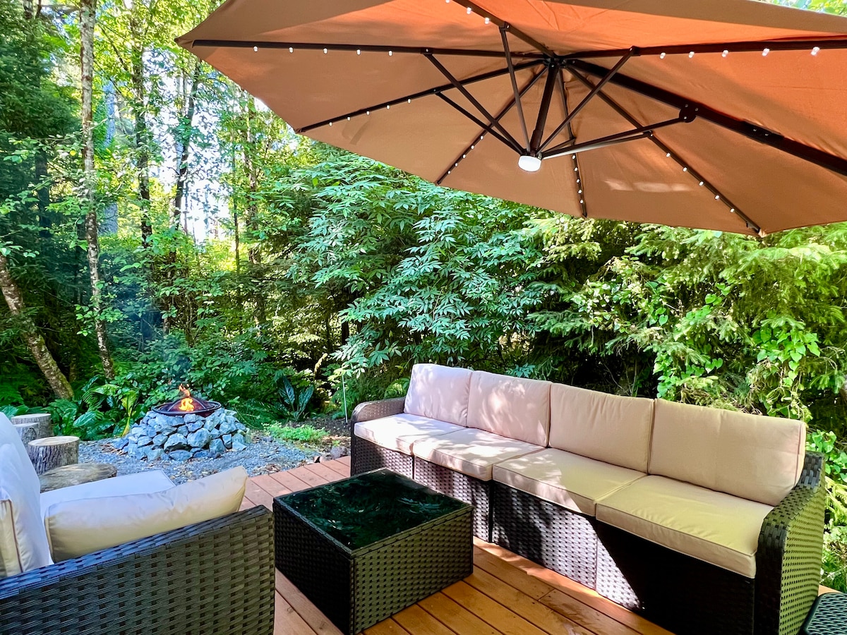Fáilte chuig Rockaway Falcon! Agus é suite ar shiúl ag deireadh bóthair chiúin, is é an teachín foraoise álainn 3 sheomra leapa, 2 sheomra folctha seo an t - éalú cósta foirfe. Suite ar imeall foraoise méith agus nóiméad ón trá, tá an teach timpeallaithe ag péine clúdaithe caonach agus gairdín whimsical. Téigh amach chuig do dheic chúil phríobháideach agus lig do scíth i dtobán te easa FAOI STIÚIR 7 nduine nó bailigh le chéile timpeall an phoill dóiteáin shéasúrach. Taobh istigh, bain sult as an gcistin atá feistithe go hiomlán, glac radharcanna foraoise agus gairdín ó gach fuinneog.