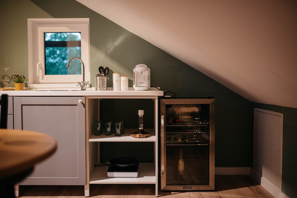 Fáilte chuig ár gcúlú sa choill! Is é an teach beag bídeach seo an áit fhoirfe chun do scíth a ligean agus dícheangal ó fhuadar agus ó fhuadar na cathrach. Lonnaithe i gceantar ciúin, timpeallaithe ag an dúlra, beidh tú in ann taitneamh a bhaint as suaimhneas agus áilleacht na timpeallachta. Tá sreabhadh creek díreach béal dorais a thabharfaidh séis deas duit agus tú ag baint sult as do thae ar maidin ar ardán an tí. Agus tú suite ar imeall na foraoise, is féidir leat iniúchadh a dhéanamh ar áille an dúlra de shiúl na gcos nó le rothair.