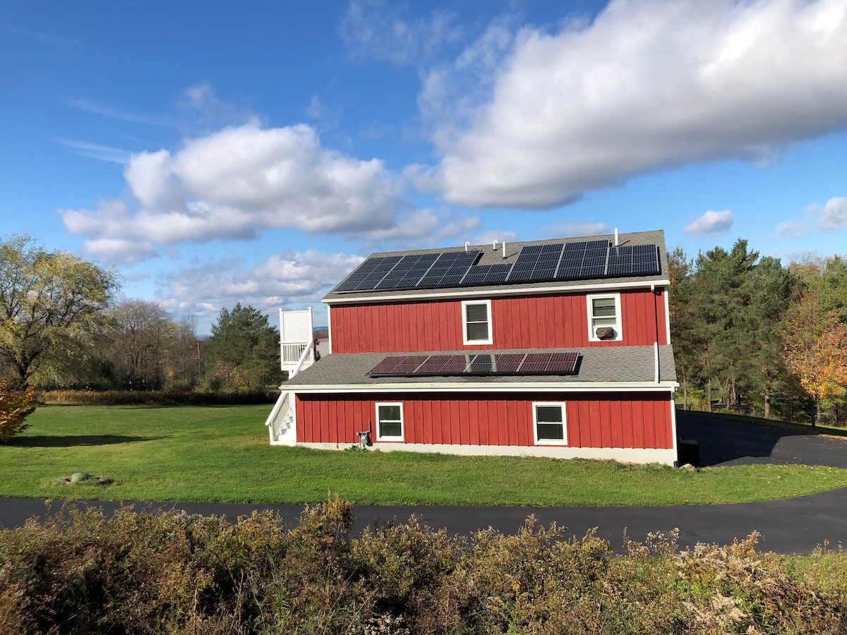 Fáilte chuig do shvuít phríobháideach ghrianmhar inár dteach tuaithe éiceabhách faoi thiomáint na gréine. Dhá sheomra móide folcadán príobháideach iomlán. Bricfeasta úr feirme. Réadmhaoin álainn shuaimhneach 42 acra cois cnoic ina bhfuil coillte, móinéir, cosáin agus locháin. In aice le lár chathair Ithaca, Cornell, Coláiste Ithaca, lochanna, easanna, páirceanna, fíonlanna, margadh na bhfeirmeoirí, agus go leor eile. Sunsets taibhseach! Réadmhaoin saor ó thobac, laistigh agus lasmuigh. Déanaimid ceiliúradh ar an éagsúlacht agus tá sé mar aidhm againn aíonna de gach cúlra a chur ar a suaimhneas mar theaghlach.
