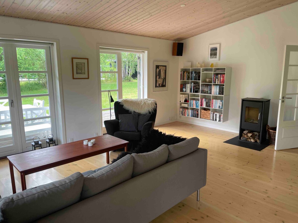 Rummelig og hyggelig bjælkehytte med stor have og plads til 8 gæster. Gåafstand til strand, natur og lokale gårdbutikker. Perfekt til familier, venner og par, der vil nyde roen året rundt. Nyd varmen fra brændeovn, vildmarksbad, indendørs spa og sauna i de kolde vintermåneder og åbn terrassedørene op mod haven og terrassen med aftensol og 10 minutters gåtur gennem en eng til stranden på de lune sommeraftener.