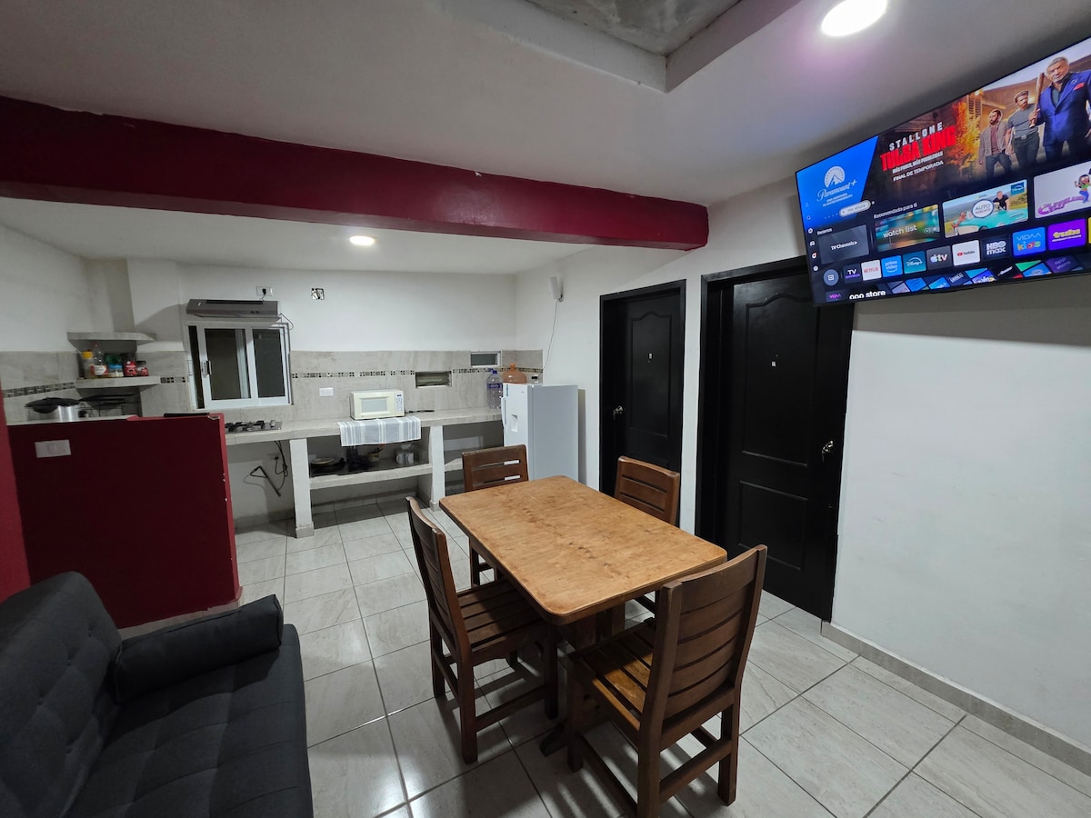 Disfruta de la sencillez de este alojamiento tranquilo y céntrico, ubicada en una zona segura de la ciudad con área verde en donde pueden instalar casas de campaña para poder alojarse más personas si así lo desean a dos cuadras de plaza valle, a solo cinco minutos de Casa Vegas, del parque de los Dinosaurios y del tobogán. El alojamiento es completo e independiente con entrada autónoma, el alojamiento cuenta con estacionamiento para autos o camionetas.