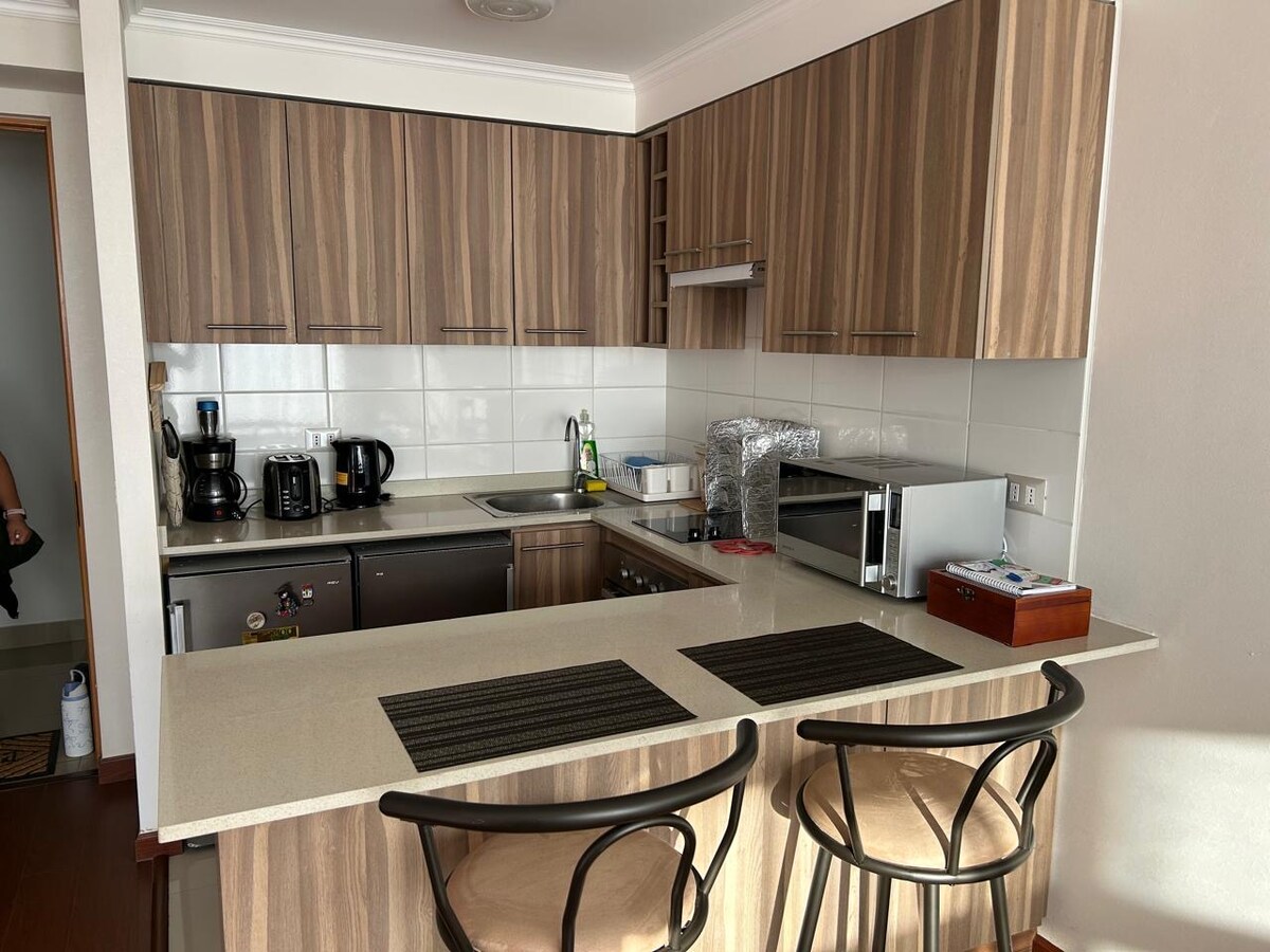Árasán nua-aimseartha le páirceáil in aice leis an aerfort. Árasán compordach sábháilte ar an 6ú hurlár le hardaitheoir, atá oiriúnach do lánúineacha, do thurasóirí nó do dhaoine in aontaí mianadóireachta. Lonnaithe ar phríomh - ascaill de Calama, le rochtain thapa ar an aerfort, tráchtáil in aice láimhe agus radharc ar Pháirc Éiceolaíochta Loa. Tá páirceáil phríobháideach, Wi - Fi, cistin fheistithe agus slándáil 24/7 in árasán geataithe san áireamh. Foirfe chun dul i do luí nó iniúchadh a dhéanamh ar an gcathair. Cuir eispéireas uathúil Calama in áirithe agus bí i do chónaí ann!