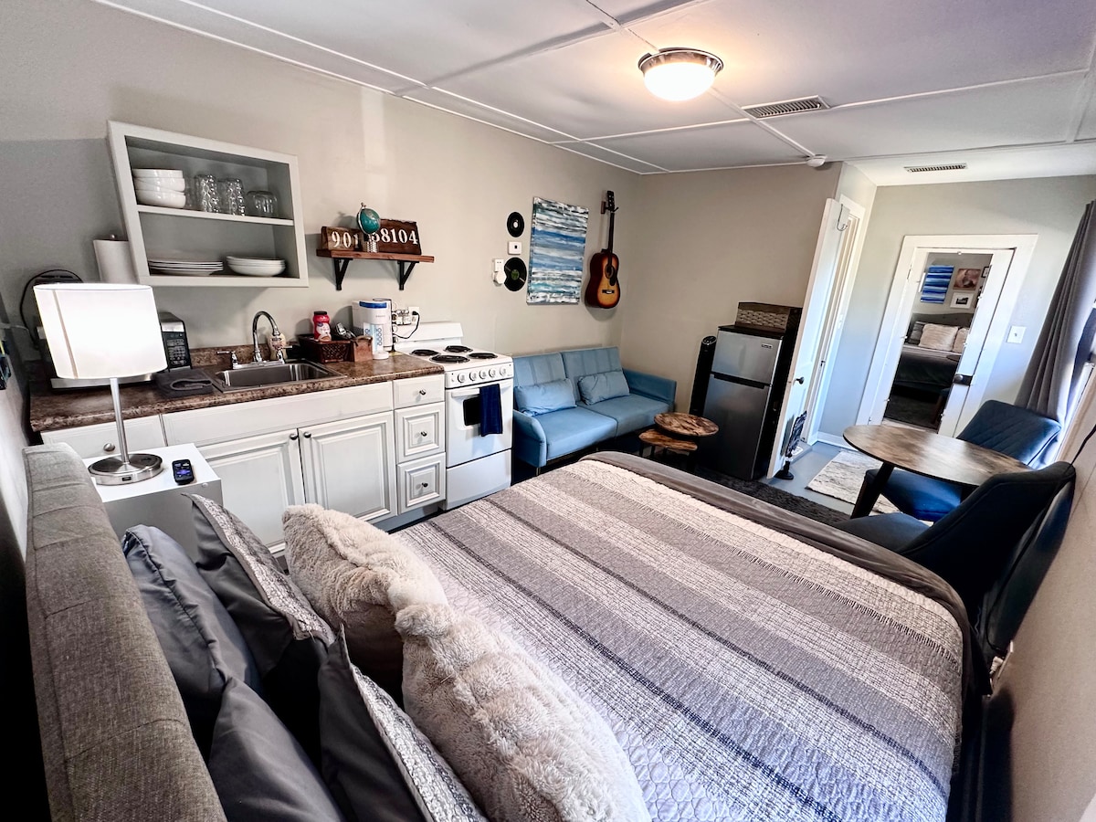 Féach ar bith eile! Is é an condo 1BR galánta seo an fanacht foirfe Downtown Memphis do lánúineacha, d'eachtraithe aonair agus do thaistealaithe gnó. Lonnaithe i gcroílár na cathrach agus maisithe go gairmiúil, cuireann sé sábháilteacht, áisiúlacht agus draíocht ar fáil. Siúil go Beale Street, The Orpheum, agus South Main Arts District. Bain sult as páirceáil gheataithe saor in aisce agus rochtain éasca ar bhia, siopadóireacht, ceol agus iompar den scoth. Faigh blaiseadh de gach rud atá le tairiscint ag Memphis - díreach taobh amuigh de do dhoras!