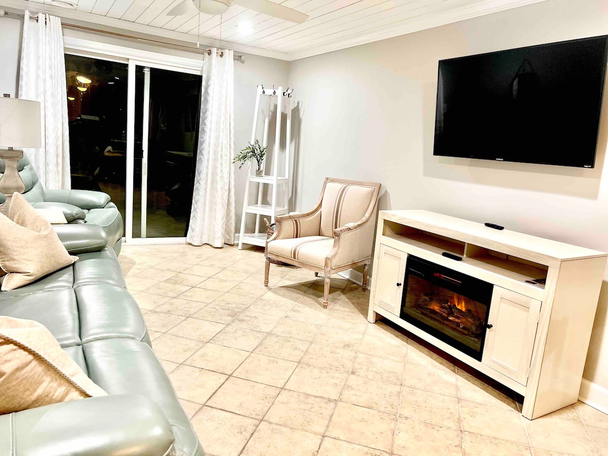 Déan dearmad ar do chuid imní sa spás fairsing suaimhneach seo. Tá an Riverbend suite díreach taobh amuigh de Wilmington NC i mbaile gleoite Burgaw. Suite ar bhruacha na hAbhainn Cape Fear, is é seo an áit is fearr le haghaidh saoire ghearr. Díreach faoi mhíle ó ionad bainise Old River Farms, 20 nóiméad ó lár an bhaile Wilmington, agus beagán níos mó go Wrightsville Beach. Tá 10 nduine fásta sa teach nó suas le 12 dhuine le páistí. Bain sult as an duga, glac roinnt den linn snámha agus imir roinnt foosball. Tá gach rud san áit seo.