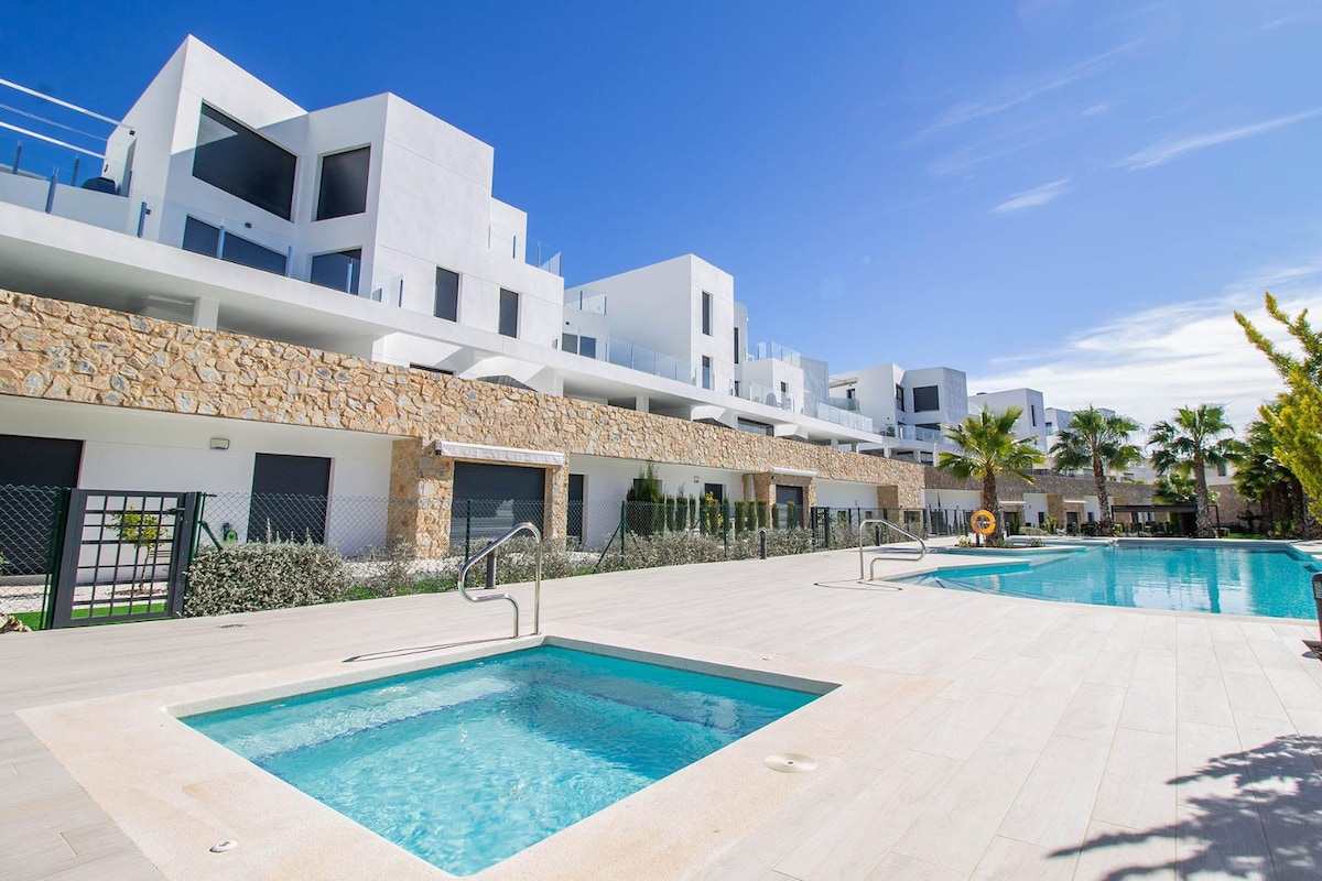 LE HAGHAIDH LAETHANTA SAOIRE TEAGHLAIGH AGUS GALFAIRÍ AMHÁIN! Tá 3 sheomra leapa in árasán fairsing ardleibhéil i bpobal nua - thógtha (tá seomra folctha en suite i seomra folctha amháin acu), seomra suí fairsing ina bhfuil teilifíseán mór cothromscáileáin, cistin lánfheistithe, agus ardán mór a ligeann duit taitneamh a bhaint as an ngrian agus radhairc iontacha ar Las Colinas Golf & Country Club agus an Mheánmhuir. Tá carrchlós idirlín agus fo - thógtha ann, tá an t - árasán feistithe go hiomlán agus tá dallóga ann.