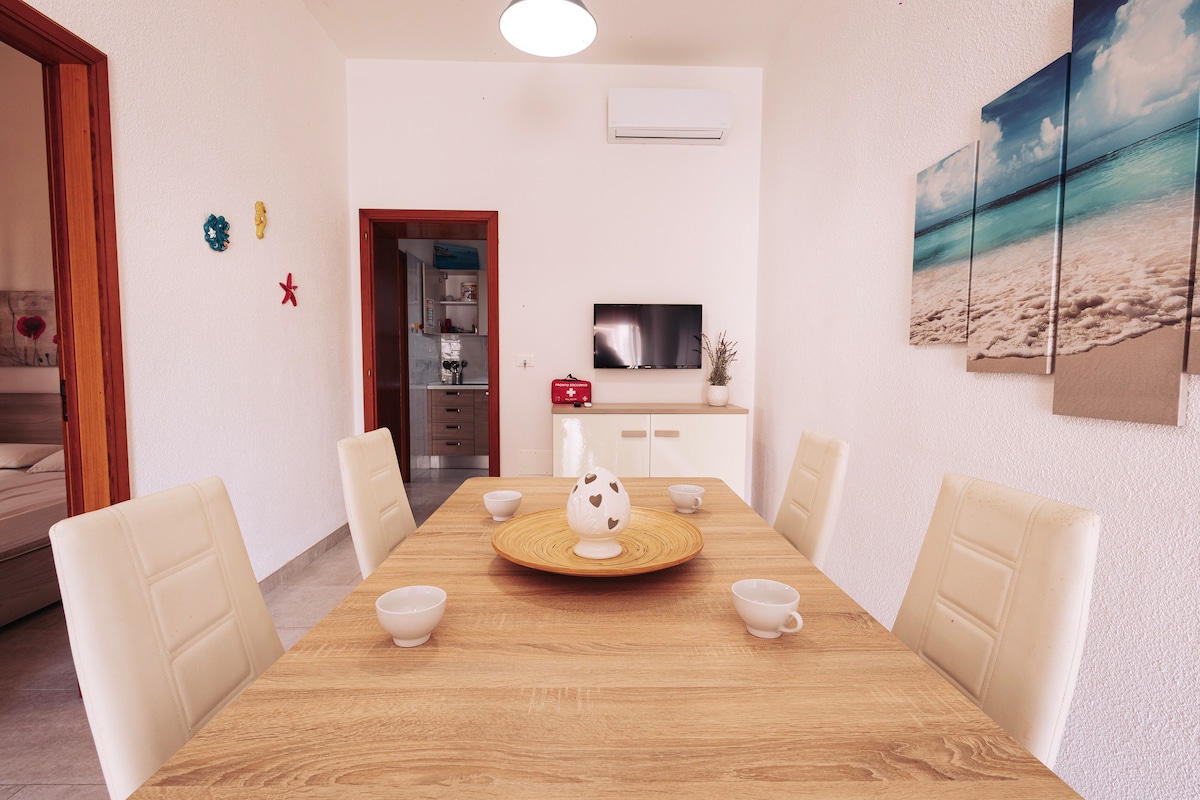Ar an mbunurlár, tá leaba thoilg agus an chéad seomra folctha i seomra mór ina bhfuil cónaí sa chistin. Ar an urlár íochtarach, geal agus aeráilte, tá na 3 sheomra leapa dhúbailte ann, gach ceann acu le rochtain ar chlóis inmheánacha phríobháideacha, agus an dara seomra folctha le cithfholcadán agus meaisín níocháin. Lasmuigh den phaitió mór le radharc na farraige clúdaithe ag gazebo adhmaid agus feistithe le bord, cathaoireacha, tolgairí gréine, beárbaiciú agus cithfholcadán lasmuigh.