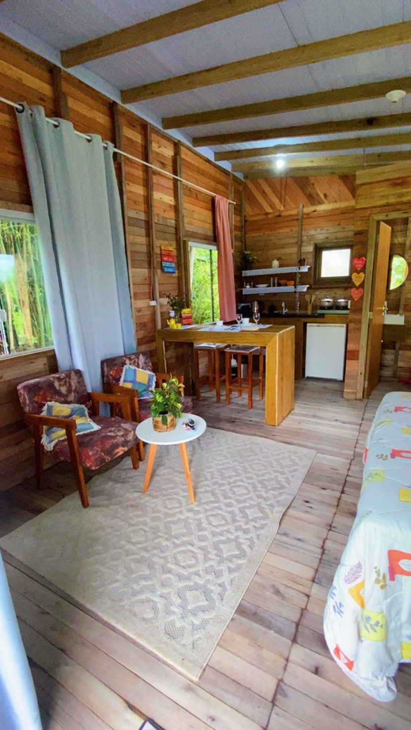 Chalé alto, ideal para até 4 pessoas. - mezanino com fácil acesso pela escada com corrimão, - sala de estar com bicama tipo sofá, espaço para os pertences e mesa de refeições. - cozinha integrada à sala: fogareiro c/ 4 bocas, frigobar, pia e balcão com todos os utensílios, panelas e chaleira; - banheiro espaçoso, com ducha eletrônica; - 1 ventiladores e ar-condicionado; - Wifi e smart TV.