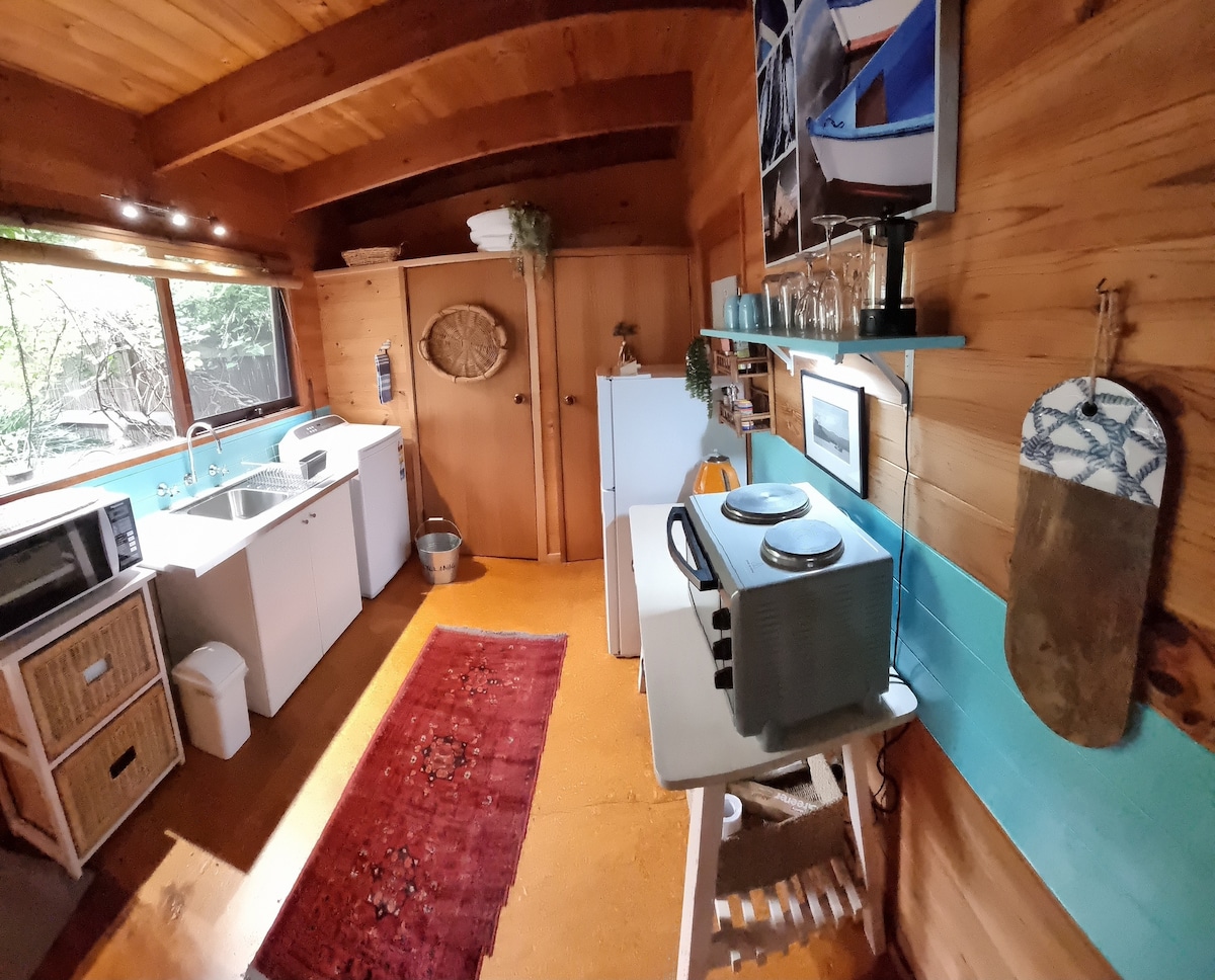 Faigh blaiseadh den Round House Retreat, nach bhfuil ach 10 nóiméad ó Bermagui, teach beag bídeach uathúil ailtireachta timpeallaithe ag coillearnach na hAstráile. Múscail canadh na n - éan, déan tú féin a chóireáil le folcadán lómhar lasmuigh, bain sult as fíon cois tine agus bain sult as sómais nua - aimseartha amhail Wi - Fi ardluais agus teilifís chliste. Ag tairiscint cothromaíocht inbhuanaitheachta agus stíle, cuimsíonn an spás seo leaba rí le braillíní línéadaigh cnáibe, cistin agus seomra folctha nua - athchóirithe, cithfholcadán lasmuigh agus leithreas múirínithe nua - aimseartha.