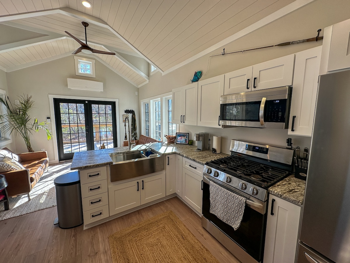 Lig do scíth & lig do scíth nuair a bhuaileann an mháthair leis an dúlra nua - aimseartha ag an Teachín Beag Glas. Tá gach spás deartha go cúramach le haghaidh fanacht compordach sómasach. Bain sult as leagan amach oscailte w/síleálacha boghtaí & gnéithe nádúrtha cré - thon, cistin agus áit itheacháin atá ag feidhmiú go hiomlán, seomraí leapa w/leapacha ar mhéid rí a thagann lena seomra folctha ceangailte féin agus póirse mór scáileáin/radharc a bhainfidh anáil díot. Tá na gníomhaíochtaí spraíúla, áineasa ar fad díreach taobh amuigh de do dhoras! Oiriúnach do mhadraí!