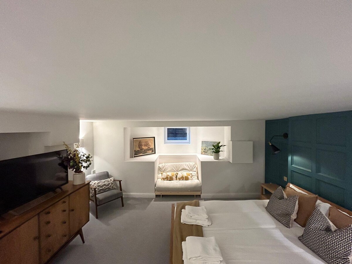 IMPORTANT: THIS IS AN INCLUSIVE PRICE - IT INCLUDES ALL AIRBNB COSTS! This spacious 3 bedroom, two bathroom property (1600 sq feet/148.5 meters sq) is on the stylish Downs, right on the edge of the town. It is partly over a small quiet business and has three dbl bedrooms, a large living room with log burner, a good sized kitchen and two bathrooms (including one en-suite) THE PROPERTY ACCOMMODATIONS IS OVER THREE FLOORS AND IS NOT THEREFORE IDEAL FOR THE ELDERLY, OR THOSE WITH MOBILITY ISSUES.
