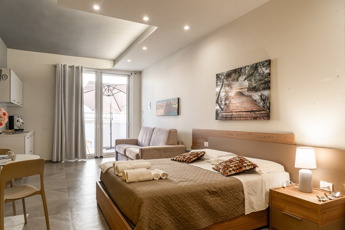 La camera Triscia dispone di un letto matrimoniale, con opzione su richiesta di due letti singoli separati e/o l'aggiunta di un terzo letto. Angolo cottura, bagno con doccia e bidè, TV, aria condizionata e WiFi incluso. Finestrone alto apribile. Ingresso principale condiviso con altri ospiti, ma con ingresso indipendente nella propria stanza.