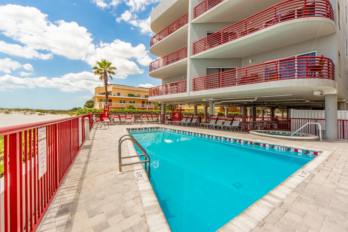 Cuireann COMPÁNTAÍOCHT LÓISTÍN SAOIRE FLORIDA i láthair... 🌴Tropic Terrace #26 Bíodh an saoire ghearr "Old Florida" is fearr riamh agat sa svuít cúinne seo ar urlár na talún ar imeall na trá. Suite ag an Tropic Terrace Resort íocónach, tá radhairc dhíreacha neamhchoitianta ar an aigéan díreach ó fhuinneoga do sheomra suí ag Suite #26. Gabh amach ón doras chuig an linn snámha théite nó téigh ar an gcosán príobháideach chuig gaineamh bán geal Oileán an Taisce—gan staighre le dul suas agus gan bóithre le trasnú. Foirfe do lánúineacha atá ag lorg tearmann rómánsúil in aice le John's Pass.