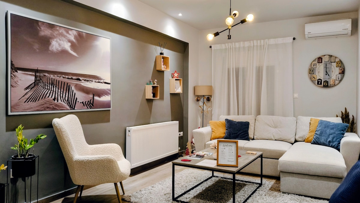 Lóistín sa bhaile mór, i gceann de na comharsanachtaí is aeistéiticiúla sa chathair. Árasán fáilteach teolaí le tocht nua - aimseartha agus cocopalm le haghaidh codlata níos taitneamhaí. Tá sé suite i uillinn shuaimhneach den ionad trádála stairiúil (Meal Oscailte Trikala), tá sé foirfe chun taitneamh a bhaint as an gcathair ar shiúl na gcos ós rud é go bhfuil na sainchomharthaí móra go léir laistigh d'achar siúil (Ceantar Manavika 2 nóiméad, Central Square 3 nóiméad, Central Bridge 5 nóiméad, Asclepiou Street 4 nóiméad, Varoussi Old Town 7 nóiméad.