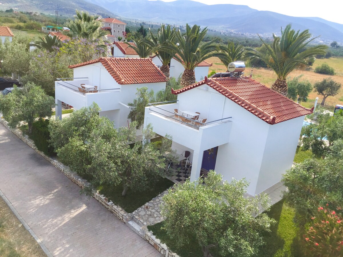 Tá ár dteach geal, ildaite agus teolaí suite i sráidbhaile beag, traidisiúnta agus cáiliúil Mycenae, díreach i gcroílár na Peloponnese, ach tiomáint ghearr ó bhaile gleoite Nafplio. Tógtha ag barr an tsráidbhaile, tá radhairc iontacha ann de na sléibhte agus den ghleann thíos. Lán le solas na gréine, balcóiní móra, fuinneoga, agus teallach álainn, tá sé foirfe d'fhanacht ciúin. Níl ach cúpla nóiméad siúil ón láithreán seandálaíochta agus gar do bhialanna agus do mhionmhargaí áitiúla.