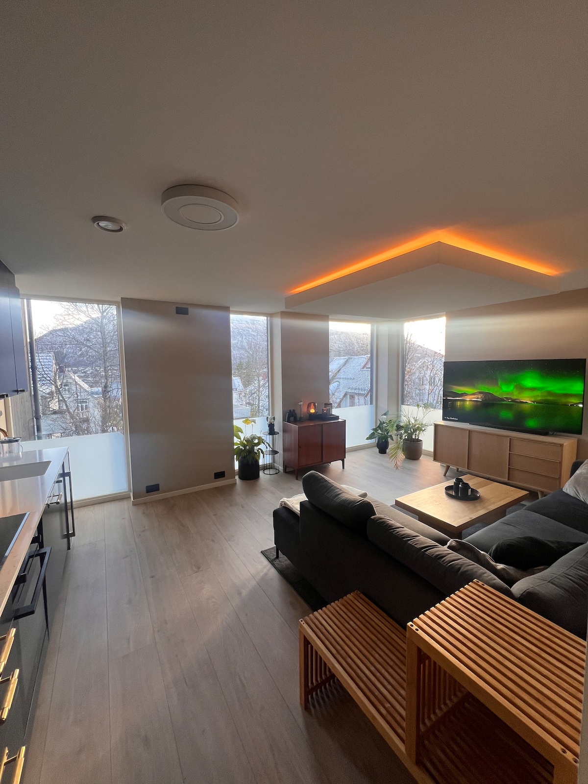 Is árasán lánléargais lárnach agus nua - aimseartha é ag barr Tromsø le fuinneoga móra i gceantar ciúin cónaithe gan mórán tráchta. Tá an t - árasán feistithe go hiomlán le gach trealamh cistine, seomra folctha, teallach, línéadach leapa, tuáillí, seomra leapa le leaba chompordach 150 cm ar leithead agus vardrús fairsing. Tá sé achar siúil 20 nóiméad go lár na cathrach, 10 nóiméad go siopa grósaera, 5 nóiméad go dtí stad bus Skoglyst le naisc bus go minic le haerfort, lár na cathrach, unn/UiT agus an t - ardaitheoir sléibhe. Tógann sé 10 nóiméad ar thacsaí chuig an aerfort.