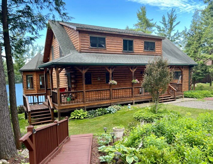 Neadaithe ar feadh 100 troigh de líne chladaigh phríobháideach loch Eaton, cumascann an cábán logála fáilteach seo teas tuathúil le compord comhaimseartha. Sreabhann an chistin gourmet atá feistithe go hiomlán isteach i limistéar maireachtála geal aerach ina bhfuil síleálacha 20 troigh atá ag ardú as cuimse. Thuas staighre, tá an phríomhsheomra suite i lochta oscailte ina bhfuil cúinne teolaí suí, ina bhfuil radhairc lánléargais ar an loch Téigh amach faoin aer chun taitneamh a bhaint as saol suaimhneach cois locha: teallach tine os comhair luí na gréine, cosán ciúin coillteach a théann go dtí imeall an uisce, duga príobháideach ar a bhfuil 4 chadhc