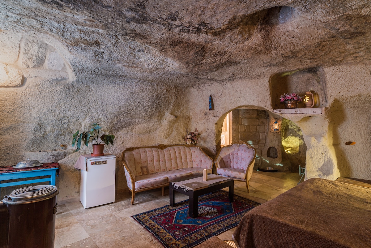 Agus é suite i bhfoirgneamh stairiúil cloiche, cuireann sé radhairc lánléargais ar fáil in Göreme Valley. Cuirimid uaimh nó seomraí cloiche ar fáil ina bhfuil téamh agus seomra folctha príobháideach. Déantar freastal ar bhricfeasta laethúil i stíl buffet. Wi - Fi agus teilifís saor in aisce sna seomraí agus sna háiteanna coiteanna.