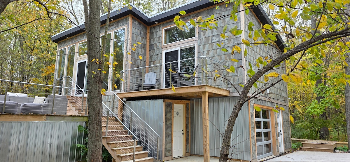 If you “glamp” when you camp, then you’ll appreciate the finer amenities of this boutique style cottage on Lake Erie. Arguably the best views in this tiny cottage community, The Kiss n Tell graces a bluff overlooking the lake - stunning views from every room. Wake to the sound of waves crashing the shore, sunbathe in loungers, dine while the sun glistens on the water, star gaze from the hot tub or sit by a lakeside fire (firewood provided). Endless options w/out leaving this beautiful space.