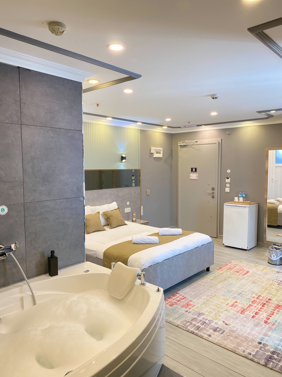 Jakuzi Oda, şehir konaklamalarında üst düzey konfor sunar. Odada büyük yatak, klima, mini buzdolabı, gardırop, çalışma masası–sandalye, ücretsiz Wi-Fi ve LCD/LED TV bulunur. Banyoda duş ve WC, havlu seti ile saç kurutma makinesi mevcuttur. Su ısıtıcısı ile çay ve küçük şişe su ikram edilir. Günlük temizlik ve 24 saat resepsiyon sağlanır