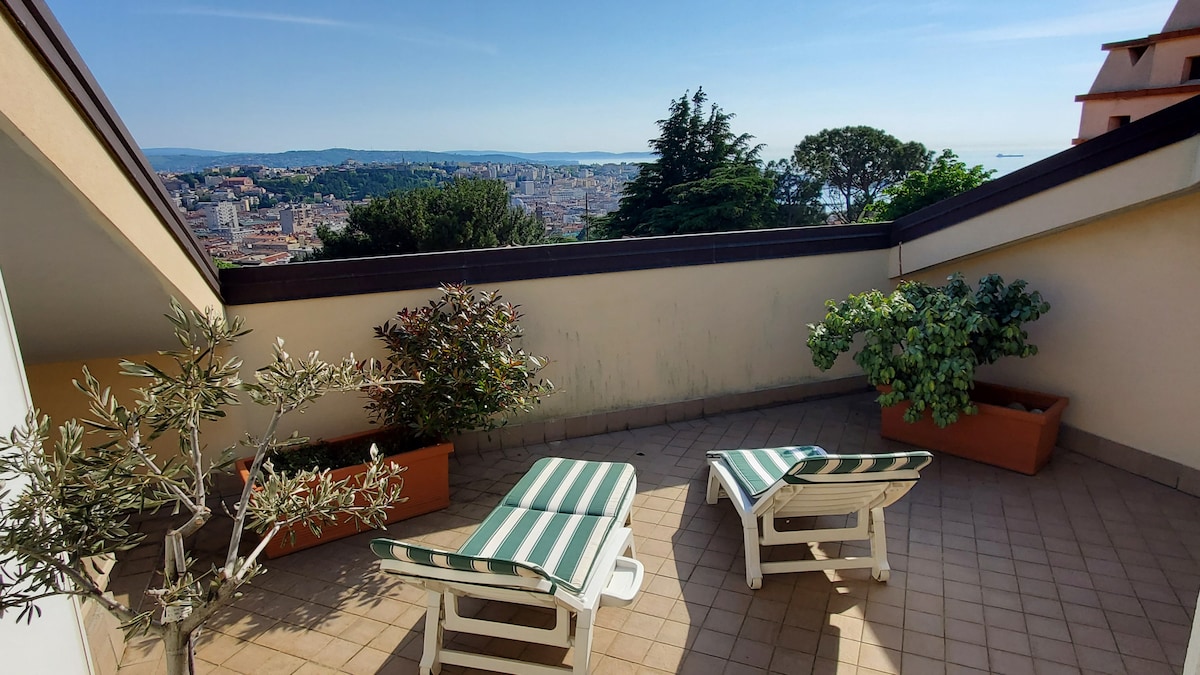 Lochta dearthóir eisiach le radhairc oscailte ar an bhfarraige agus ar an gcathair. Páirceáil garáiste in áirithe taobh istigh de limistéar príobháideach le geata uathoibríoch. Wi - Fi saor in aisce. Cistin iomlán, áit chodlata le vardrús, tábla, tolg, stiúideo, seomra folctha, níochán, ardán mór grianmhar le príobháideacht iomlán. Bunáit ar leith do laethanta saoire in Trieste agus sa timpeallacht; thart ar 200 m ó stad "Tram de Opcina ". Tá fáilte roimh gach duine.
