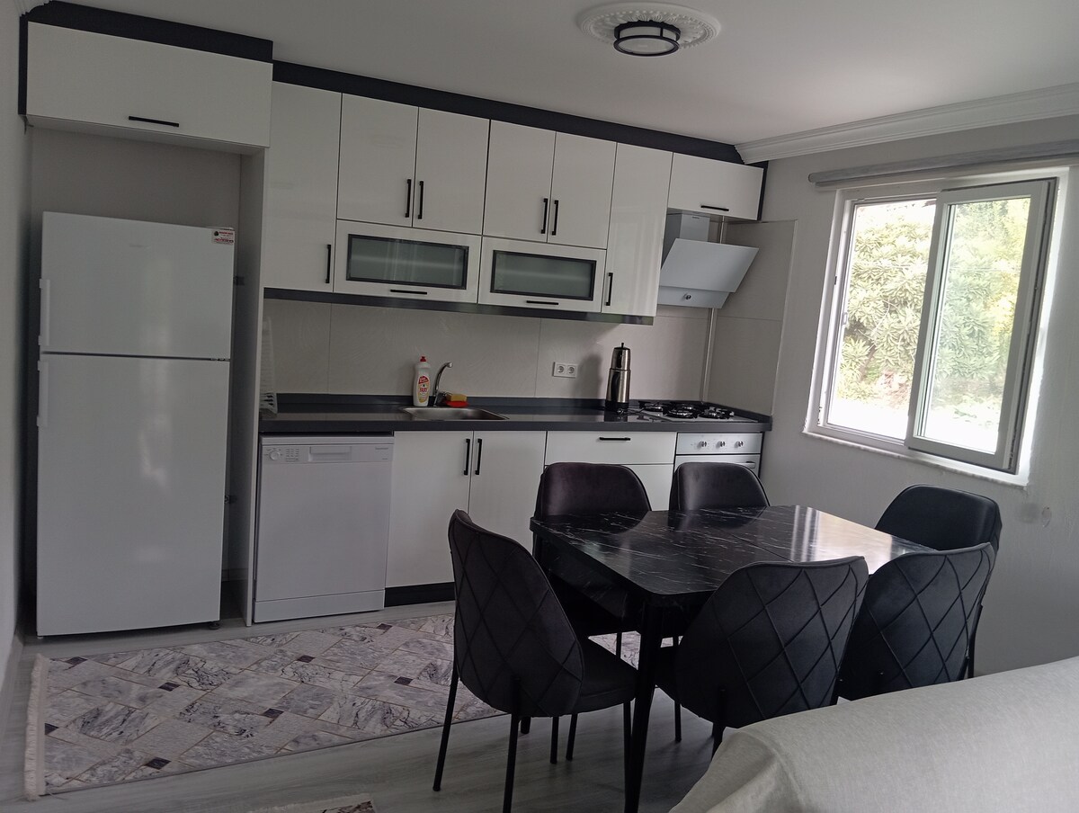 Bungaló uathúil i ngairdín oráiste agus líomóide soiniciúil shocair. San iarnóin, siúlóidí san aer úr cois farraige in Akyaka 10 nóiméad sa charr ón teach, siúlóid san fhoraois ghiúise díreach taobh thiar de, marcaíocht ar chapall sa chobhsaí. Sa tráthnóna is féidir leat féachaint ar an tsraith Netflix is fearr leat agus do scíth a ligean i jacuzzi téite. Ollmhargadh agus siopa alcóil 10 nóiméad de shiúl na gcos.