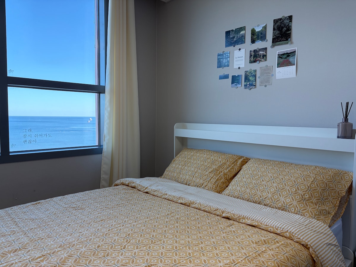 Is lóistín radhairc aigéin é seo inar féidir leat an fharraige a fheiceáil i gceart nuair a osclaíonn tú do shúile ón leaba ar maidin. Ar ndóigh, is féidir leat féachaint ar éirí na gréine freisin.❤️ Is spás oiriúnach é do suas le ceathrar agus iad i lár Chathair Donghae. Athraímid an éadaí leapa go glan gach uair. Tá an phromanáid inar féidir leat an fharraige agus an fhoraois a mhothú os comhair an lóistín “molta go hard ”~👍👍👍🥰