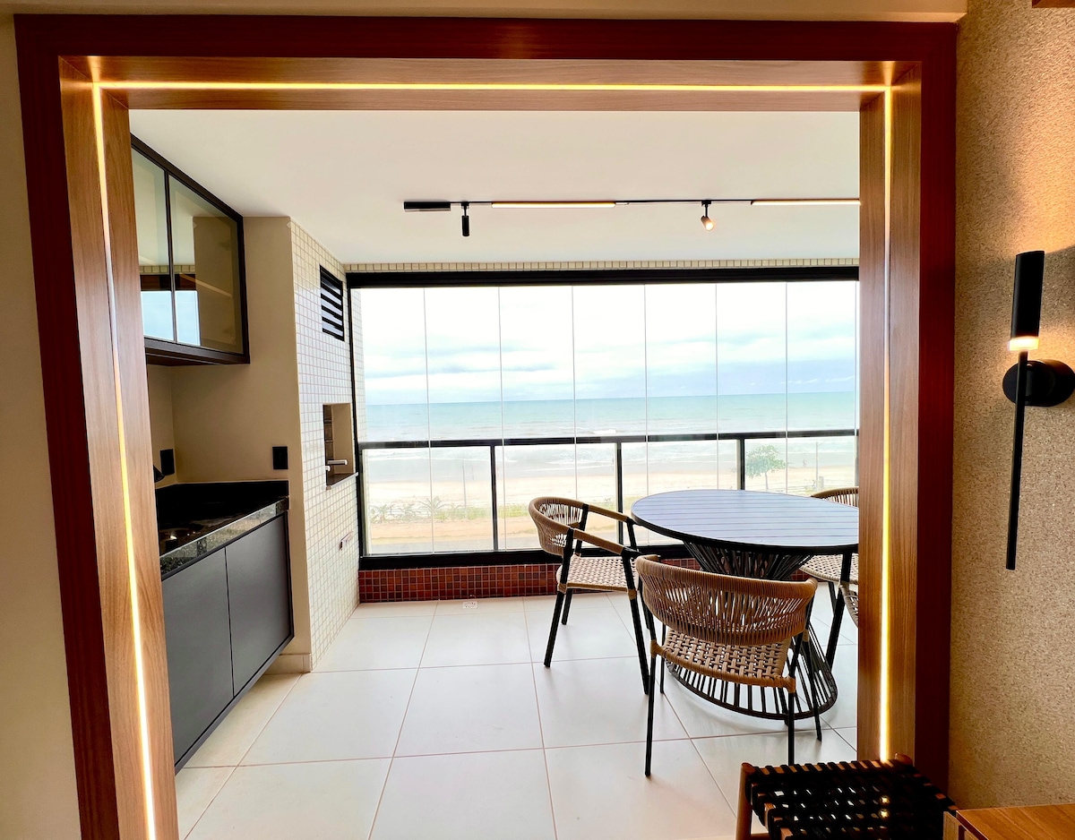 Apartamento na Praia dos Milionários, com vista frontal para o mar! São 2 quartos, ar-condicionado em todos os cômodos, Wi-Fi, sala ampla, cozinha equipada, varanda com vista para o mar, 2 banheiros (social e suíte) e vaga de garagem. Em frente à praia, basta atravessar a rua! Condomínio com segurança 24h, piscina de borda infinita, área de lazer completa e elevador. Conforto, praticidade e visual inesquecível para sua estadia no litoral baiano.