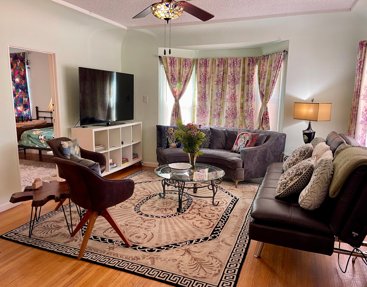 Tar lounge i stíl sa Hollywood Hills. Tá gach rud a d'fhéadfadh a bheith ag teastáil uait sa seomra folctha príobháideach seo - seomra leapa mór, cistinéad, seomra suí, seomra folctha, agus póirse clúdaithe ollmhór iata. Tógann an spás seo maireachtáil laistigh/ lasmuigh go dtí an chéad leibhéal eile i ndáiríre. Tá teach crainn vibe sa phóirse agus leaba lae crochta ann. Tá gairdín breise ann chun do scíth a ligean ann. Tá gach áit príobháideach, lena n - áirítear bealach isteach príobháideach geataithe le haghaidh slándála breise. Páirceáil sráide Ample os comhair na réadmhaoine.