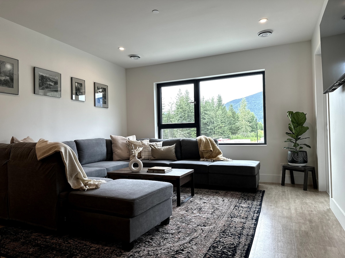 Árasán úrnua nua - aimseartha 2 sheomra leapa, atá suite i gcomharsanacht shuaimhneach díreach 5 nóiméad sa charr chuig Revelstoke Mountain Resort agus tiomáint 5 nóiméad go lár Revelstoke. Cistin lánfheistithe atá foirfe chun béilí a dhéanamh díreach cosúil leis an mbaile. Bain sult as áisiúlacht meaisín níocháin & triomadóra, páirceáil faoi thalamh, agus stóráil thiomnaithe sciála & rothar. Lig do scíth ar an deic fhairsing agus glac na radhairc iontacha, nó lig do scíth istigh ar an tolg mór rannach. Áit fhoirfe do d'eachtraí samhraidh agus geimhridh go léir.