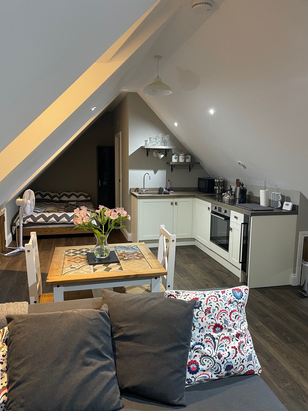 Is spás geal cluthar nua - aimseartha é an stiúideo ar athchóiriú féinchuimsitheach é ar thaobh ár dtí le bealach isteach príobháideach agus páirceáil saor in aisce díreach taobh amuigh. Tá an t - airbnb 12 nóiméad siúil ó Stáisiún Traenach Hitchin. Foirfe do chomaitéirí Londan, tá sé oiriúnach freisin do lánúineacha nó do thaistealaithe aonair, do chuairteanna teaghlaigh, do thaisteal gnó srl. Is féidir leat seiceáil isteach ó 4pm Dé Luain - Dé hAoine. Tá an t - am don tseiceáil isteach ar an Satharn agus ar an Domhnach ag 2.30pm. Tá páirceáil saor in aisce ar feadh d'fhanachta ar fad, 7 lá na seachtaine.