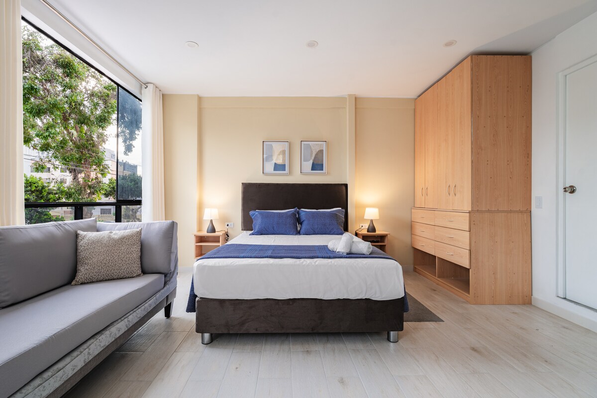 Fáilte go dtí an áit fhoirfe do d'fhanacht in Lima! Tá dearadh nua-aimseartha, compord agus suaimhneas thar barr le chéile inár stiúideo, rud atá foirfe do thaistealaithe gnó nó do thurasóirí atá ag lorg síocháin ag deireadh an lae. Bain sult as an áit chiúin lárnach seo. Spás geal, príobháideach agus ciúin óna bhfuil radharc ar an limistéar glas. Lig do scíth i leaba mhór compordach tar éis lá fada ag iniúchadh nó ag obair. Tá cistin fheistithe, seomra folctha iomlán agus Wi-Fi ardluais ann.