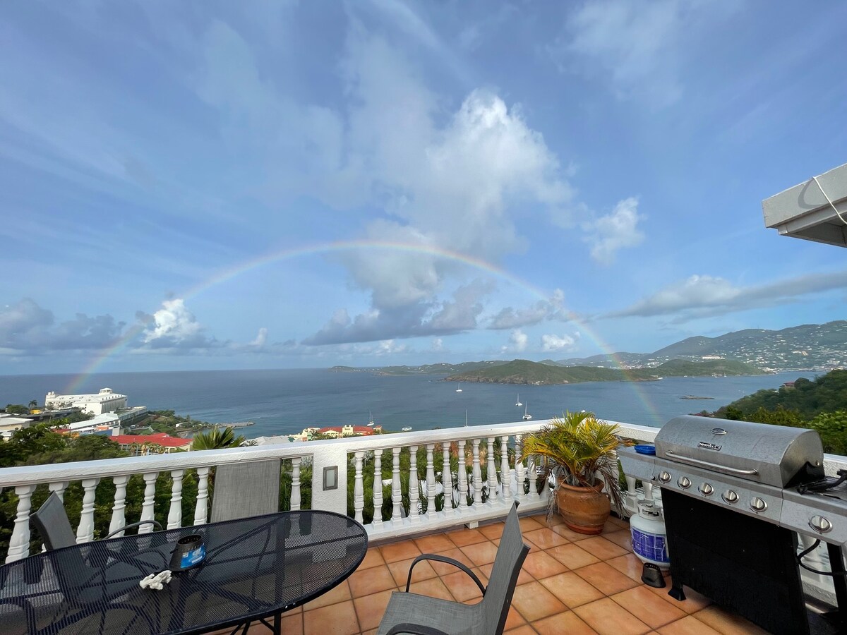 Radharc iontach ar luí na gréine agus ar an aigéan ón villa álainn seo atá suite i measc na gcrann i bparthas. Sreabhann spás maireachtála flaithiúil le raon rómhór isteach sa phaitió agus sa limistéar linn snámha lasmuigh, foirfe le haghaidh luí na gréine, beárbaiciú le cairde agus le teaghlaigh, nó manglam faoi limistéar an chábáin scáthaithe. 2 sheomra leapa lán - oiriúnaithe don aer agus 2.5 seomra folctha thart ar an réadmhaoin iontach seo! Nóiméid go Havensight, Yacht Haven Grande, Charlotte Amalie, agus siopaí agus bialanna éagsúla!