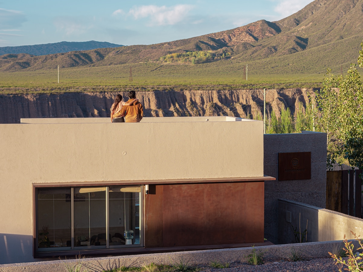 Teach boutique tuaithe atá deartha i gclocha roghnaithe go díreach ón sliabh, gloine, stroighin agus iarann le radhairc iontacha ar na Sléibhte Andes, gairdín mór olóige, agus timpeallaithe ag na fíonlanna is mó cáil de Mendoza. Feistithe le cistin mhór, seomra ina bhfuil ardán agus dhá sheomra folctha fhairsinge. Tá sé suite in áit an - sábháilte le faireachas príobháideach 24 uair an chloig, 5 nóiméad sa charr ó bhaile Chacras de Coria. Áit idéalach chun imeacht uaidh ar fad.