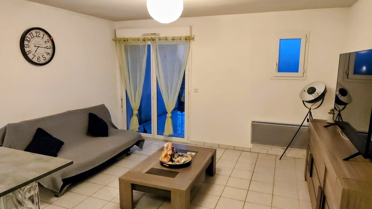 Leathspleách Apt Plain Pied 48m2, áit chónaithe shlán, linn snámha , 1.5 km ón lár stairiúil. Ardán clúdaithe: tábla, 4 chathaoir, 2 chathaoir deice. Seomra suí, cistin atá feistithe le micreathonnán, oigheann leictreach, hobanna ceirmeacha, cuisneoir, reoiteoir, miasniteoir, teilifíseán. Leaba thoilg an tseomra suí 2 dhuine i 160, folcadán: doirteal, folcadán, cithfholcadán, meaisín níocháin. Leaba chbre 160, leaba leapa, vardrús gd. Timpeallacht chiúin agus ghlas. Cuirtear gach línéadach tí ar fáil. Tuáillí suas le € 15. LINN SNÁMHA DÚNTA AR AN 30 MEÁN FÓMHAIR.