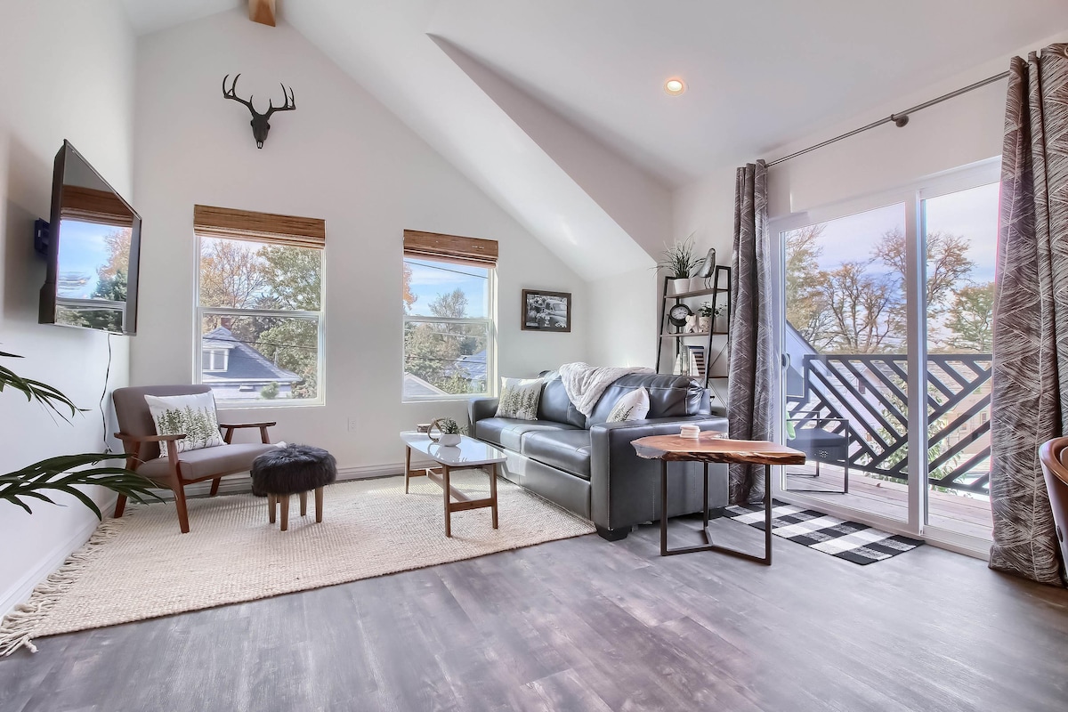 Fáilte chuig do thearmann galánta oscailte - staidéir! Tá áit chónaithe ghalánta, cistinéad dea - fheistithe, agus leaba agus folcadán príobháideach le feiceáil sa spás cluthar nua - aimseartha seo. Níl sé ach 10 nóiméad go Downtown, Coors Field, Ball Arena & Empower Field agus thart ar 30 nóiméad go dtí/ón aerfort, agus Sléibhte Rocky in aice láimhe. Rochtain thapa ar I -70 le haghaidh turais sciála nó tiomáint 20 nóiméad chuig Amfaitéatar Red Rocks. Bain sult as an meascán foirfe de chompord, de dhraíocht agus d'áisiúlacht dheiridh do d'fhanacht in Denver! Táimid ar bís le tú a óstáil!