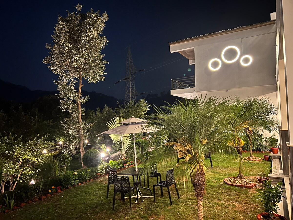 A rare hexagon duplex that frames the mountains. Design forward, warm, and quiet. Perfect for couples or a small family. Evara is for guests who love design. The hexagon shape gives you glass on every side and the view feels close. The living space is open, the bedroom is cozy, and the sky is always near. WiFi is fast, power is backed up, and parking is free. Drive in from Delhi or take the train to Kathgodam. Quiet hours keep the mood gentle.